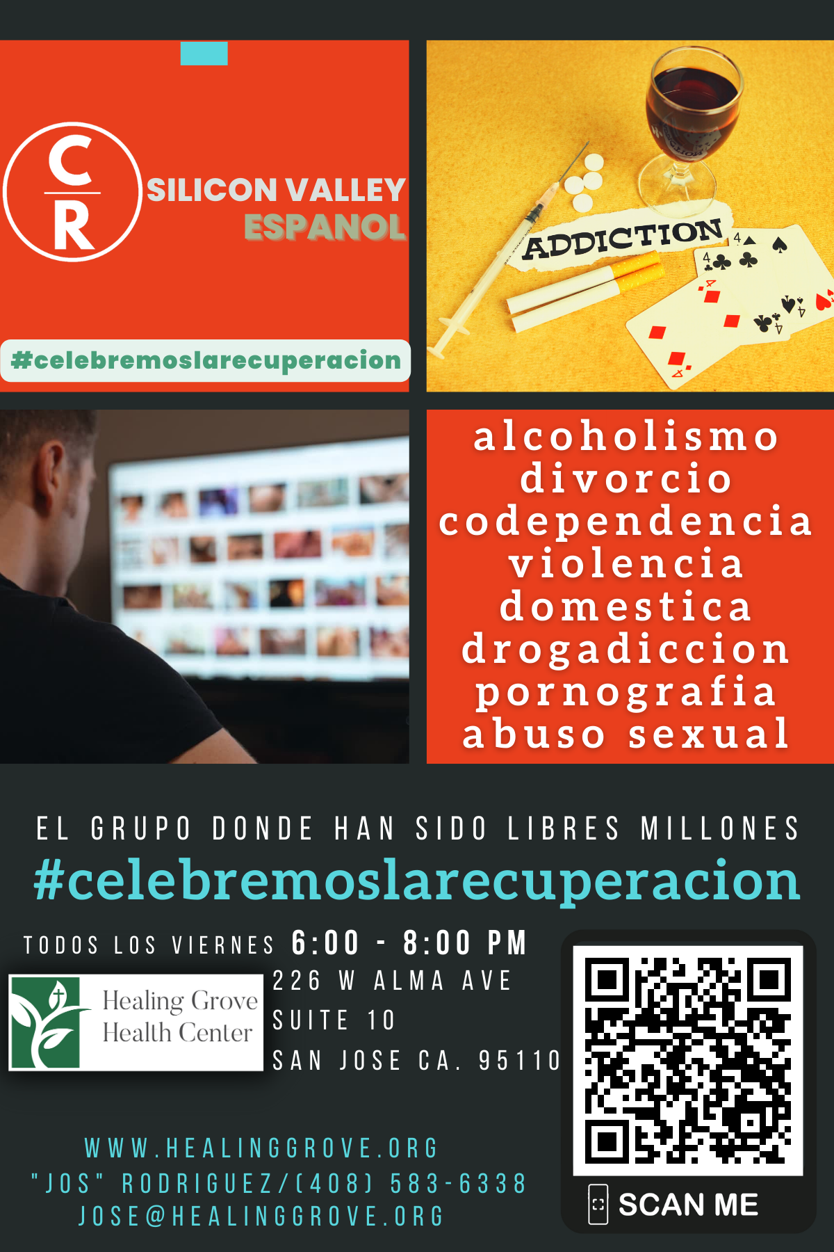 La Clínica Hojas de Sanidad (Healing Grove) esta ubicada estrategicamente en zona centro de San Jose, California para atender al mayor numero de participantes de Celebremos la Recuperación. Parte de nuestra misión, es el cuidado de la salud, el cuidado del alma, y el cuidado de la cultura por eso hemos trabajado muy de cerca durante los últimos años con la comunidad hispana en el tema de salud mental. Existen grandes retos que abordar entre la comunidad y para eso hemos creado espacios y talleres como Celebremos la Recuperación. Te invitamos a que hagas un recorrido virtual junto con nuestros facilitadores Jos y Ben Paredes y te adentres a lo poderoso y transformador que es este programa para que puedas vivir en libertad. Hay un poder dentro de ti y le puedes llamar por su nombre.